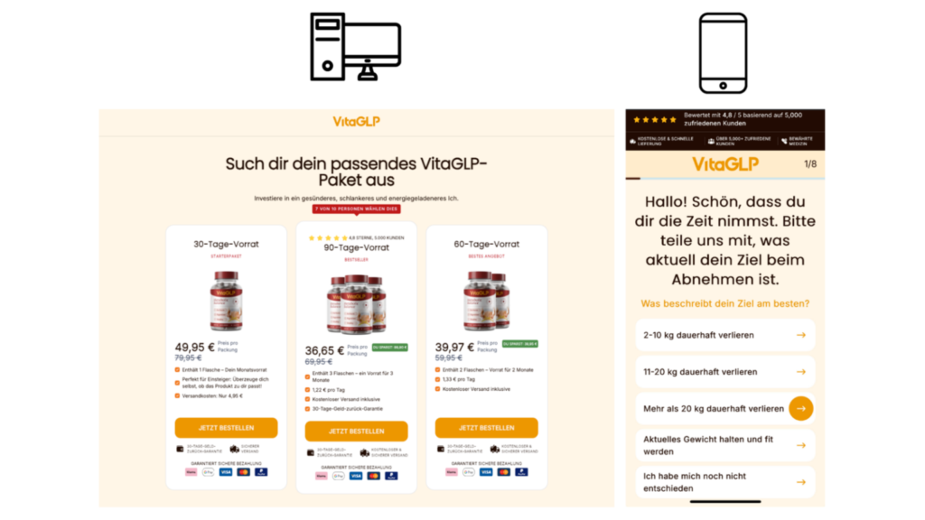 Über die offizielle Website werden Sie vor dem Kauf von VitaGLP zu einem kurzen, persönlichen Quiz weitergeleitet. Dabei beantworten Sie einige Fragen zu Ihrem Körper, Ihrem aktuellen Gewicht und Ihren individuellen Zielen zur Gewichtsabnahme.